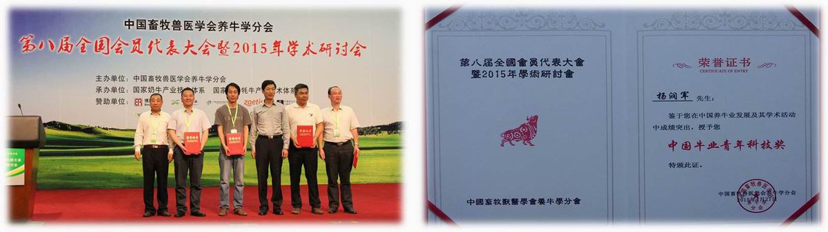 本届大会首次设立并向全国4名优秀青年学者颁发了中国牛业科技奖。我校bv伟德国际1946杨润军副教授被学会授予中国牛业青年科技奖,博士研究生付瑶获得优秀墙报奖,硕士研究生龙小娟获得优秀报告奖。